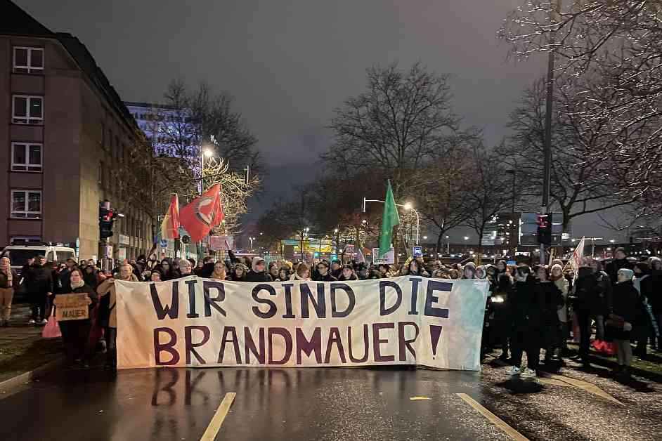 Ein Tag nach einer folgenschweren Abstimmung im Bundestag fanden am Donnerstag (30.1.) in verschiedenen Städten Demonstrationen statt, um gegen die Zerstörung der Brandmauer und die rechtsradikalen Pläne zur Verschärfung des Asylrechts zu protestieren. In Düsseldorf versammelten sich trotz kurzer Vorbereitungszeit etwa 5000 Menschen auf dem Burgplatz, um lautstark zu verkünden: „Wir sind die Brandmauer“.