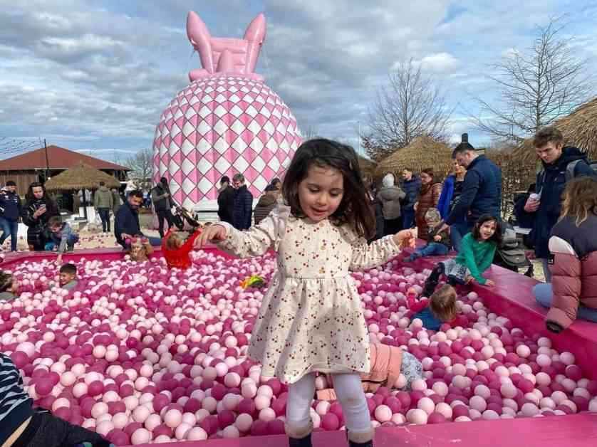 Im Bereich B, der nur mit Eintritt zugänglich ist, erwartet die Besucher ein zauberhaftes Ambiente mit tausenden bunten Ostereiern, fröhlichen Frühlingsblumen und liebevoll gestalteten Oster-Fotospots wie der Osterpyramide. Kinder können sich auf riesigen Hüpfburgen im Osterlook austoben und den großen Kinder-Spielplatz erkunden. Bei schlechtem Wetter steht eine überdachte Strohscheune für sicheres Toben und Spielen zur Verfügung.